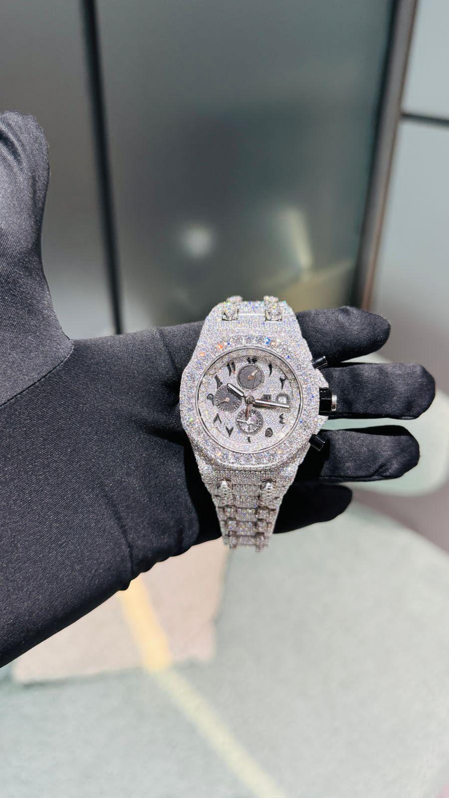Experience elite craftsmanship and brilliance with the AP VVS Moissanite Diamond Watch, a statement of pure excellence. Every inch of this timepiece is meticulously paved with 3690 VVS Moissanite diamonds, each hand-set to achieve the ultimate iced-out effect.