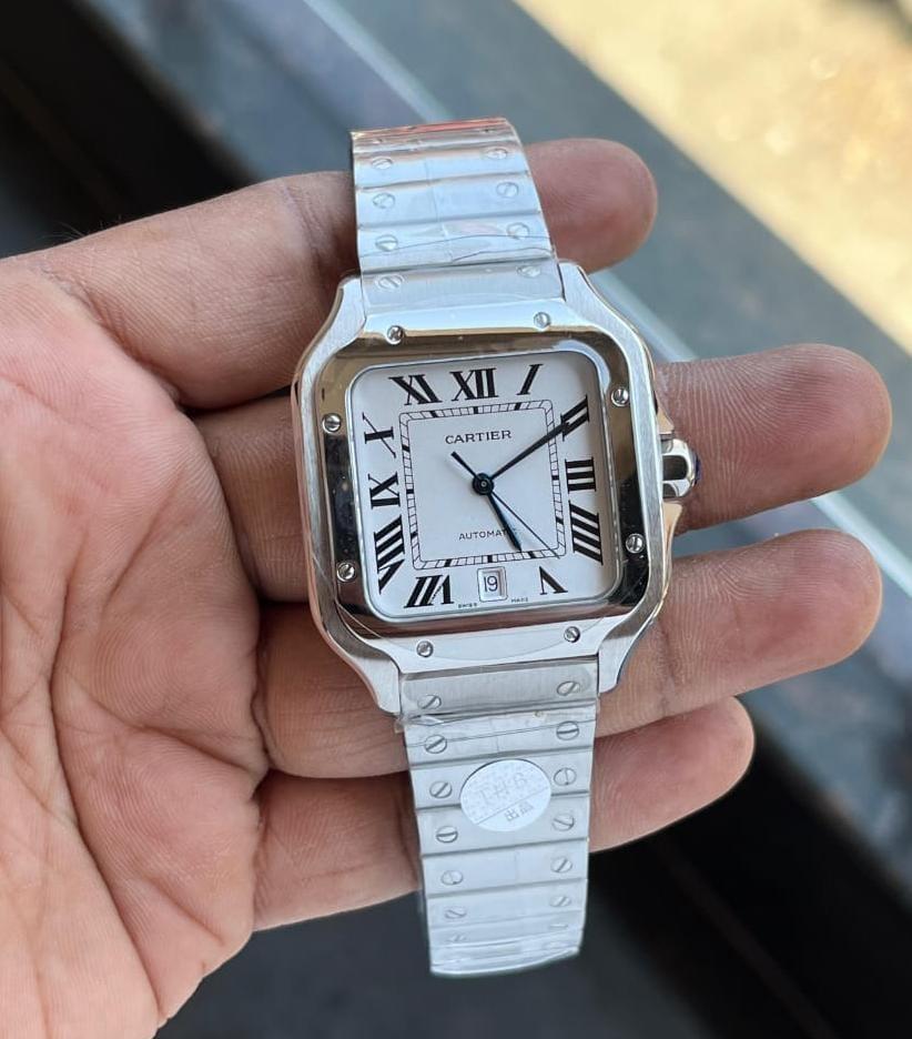 This Santos de Cartier watch bears a confident 35.1mm x 41.9mm case diameter crafted from stainless steel. A deep and mesmerising gradient brown dial is home to steel sword-shaped hands and classic Roman numeral hour indexes. The watch is powered by the in-house developed Cartier 1847 MC calibre, which powers the hands around the dial with precision, offering a 42-hour power reserve. Comes complete with an additional brown leather strap. This Santos de Cartier watch protects the movement inside a 100-meter water resistant case and Features a seven-sided crown with a synthetic blue spinel at its tip. The stainless steel bracelet of the men's Santos de Cartier watch is integrated with the company’s QuickSwitch technology. The dial of this Cartier Santos watch is protected by an anti reflective and scratch resistant sapphire crystal glass lens and features a date aperture at 6 o’clock. Two years international guarantee on all Cartier watches. Register to enjoy an extension to the Cartier International Guarantee up to 8 years with Cartier Care as well as a range of exclusive benefits and services.